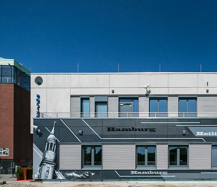 Die städtebauliche Setzung der Stadionwache ist einzigartig: Als freistehendes Gebäude, das direkt auf dem Heiligengeistfeld steht, vermittelt es direkt zwischen Millerntorstadion, Bunker und der riesigen Freifläche, auf der temporär der Dom stattfindet. Die Architektur ermöglicht den Nutzern die Aneignung ihrer autarken Räumlichkeiten. Die Polizei, als größte Nutzergruppe, stellte in der Planung eine besondere Herausforderung dar. Spezielle Sicherheitstechnik und -anforderungen führten zu einer sehr individuellen Bauausführung. Das Gebäude gliedert sich formal in zwei liegende, zueinander versetzte Kuben, die durch eine Flügelwand mit angeschlossenem Vordach voneinander getrennt werden. Die Veröffentlichung der Grundrisse ist leider aus Sicherheitsgründen nicht möglich. Die Zonierung der autarken Nutzungen erfolgt über heterogene Grundrisstypologien die je nach Bedarf zugeschnitten sind. Erschlossen werden alle Einheiten separat von einander.