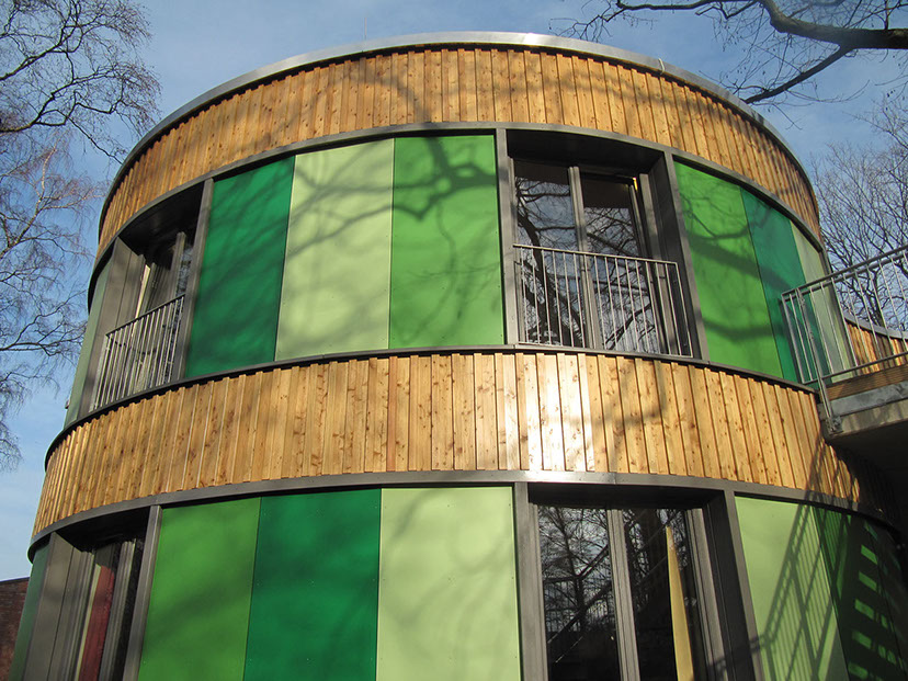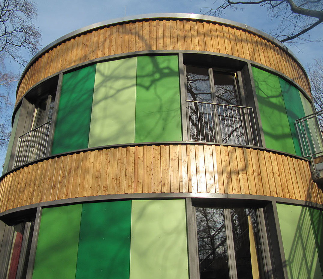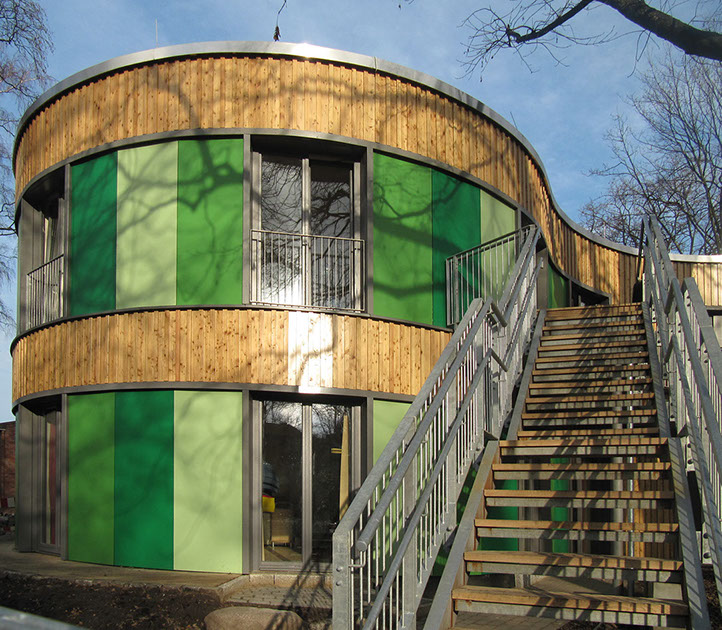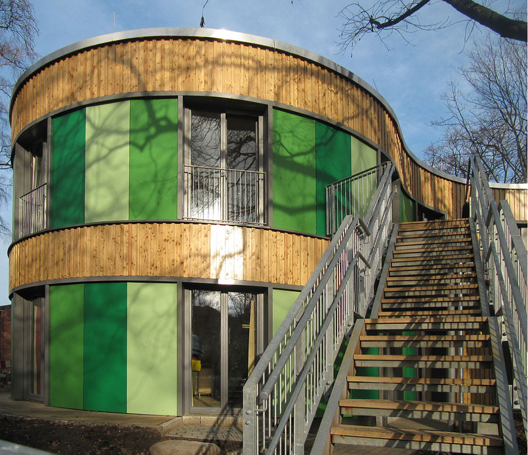 Am Rand des grünen, campusartigen Geländes der Stiftung Anscharhöhe trifft Idylle auf die orthogonale Kante der Straße. Der fast 100-jährige Baumbestand musste geschützt werden und im Einklang mit dem neuen Gebäude leben. Spielerisch folgt nun die geschwungene Kubatur dem Gelände und umschließt die Bäume. Von dieser Synergie profitieren sowohl die Außen-, als auch die Innenräume, in denen Ausblicke in die Natur und schattenspendende Wirkungen generiert werden. Die natürlichen Materialien und Farbtöne der Fassade und der Innenräume vervollständigen das vernetzte Zusammenspiel von Innen und Außen. Auf der Straßenseite steht die Kita mit gerader Linie parallel zum Fußweg.